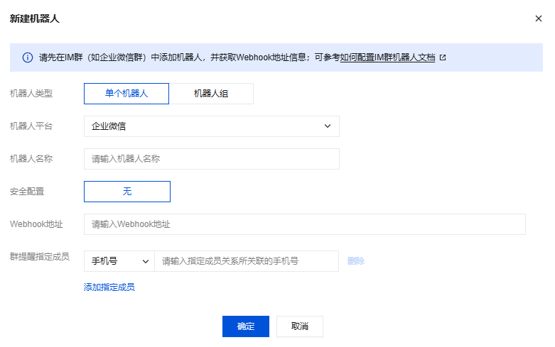 机器人类型:支持单个机器人、机器人组(可添加多个机器人 Webhook 地址)。