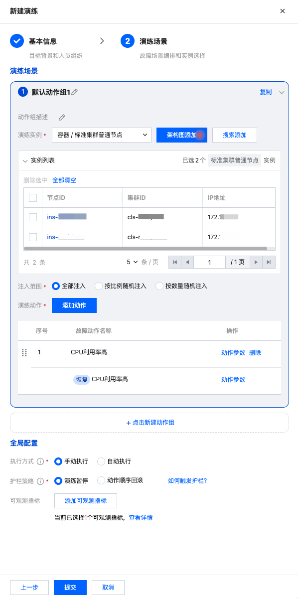 根据演练方案,在智能顾问-混沌演练上提前创建演练任务,主要完成演练对象实例范围选取、故障场景动作的编排、添加业务稳态监控指标等。如下图所示: