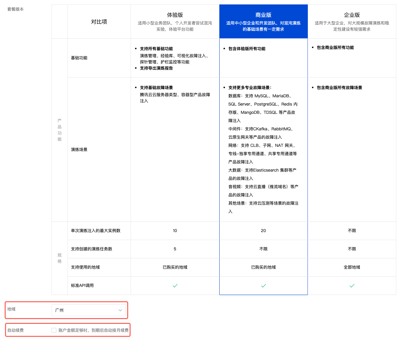 智能顾问-混沌演练提供三种类型套餐,详情请参见