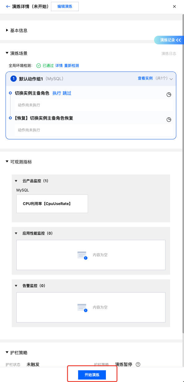 完成演练任务创建后,单击查看详情,或在演练任务列表页单击演练名称,进入演练详情页。
