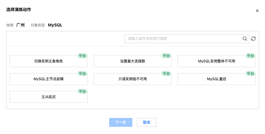 3. 添加演练实例,单击架构图添加,选择云架构图上的 MySQL 图元,在详情页中勾选想要演练的实例资源,添加到实例列表中。(亦可单击搜索添加,在搜索返回列表中选择实例添加到实例列表中)