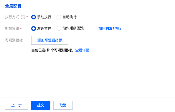 5. 在全局配置中配置执行方式、护栏策略,及添加可观测指标。完成后单击提交。