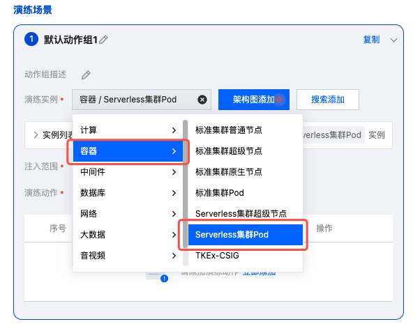 3. 在演练实例中,选择容器-Serverless 集群 Pod,选择后点击搜索添加,添加实例资源。亦可通过架构图添加方式,直接点击架构图上的 TKE 资源,选择实例进行添加。