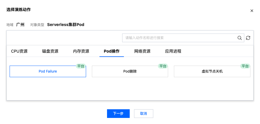 4. 完成添加实例后,点击添加动作,在 Pod 操作分类下,选择故障动作 Pod Failure,点击下一步。