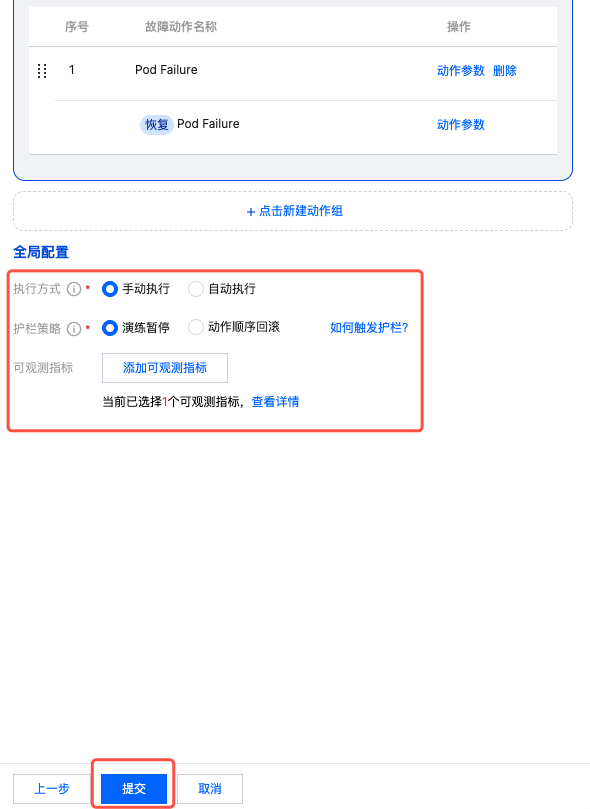 6. 参数配置完成之后,在全局配置中选择执行方式、护栏策略,及添加可观测指标。配置完成后,点击提交,即可完成演练任务创建。