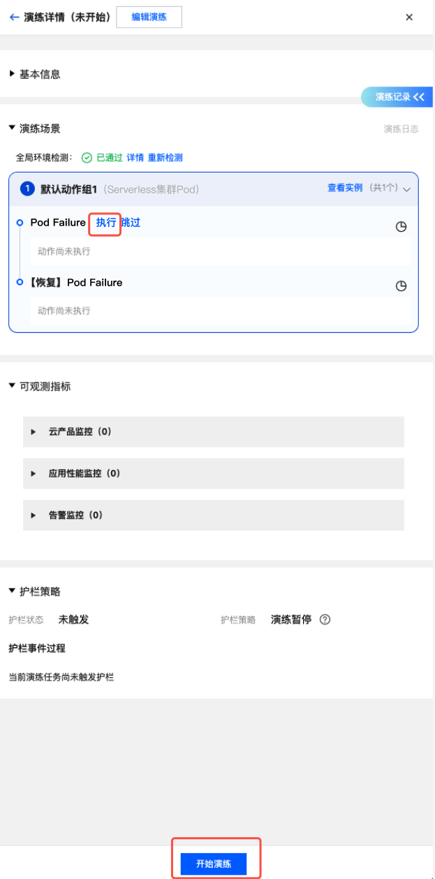 1. 进入演练详情,点击故障动作组中的执行,或下方开始演练,注入故障。