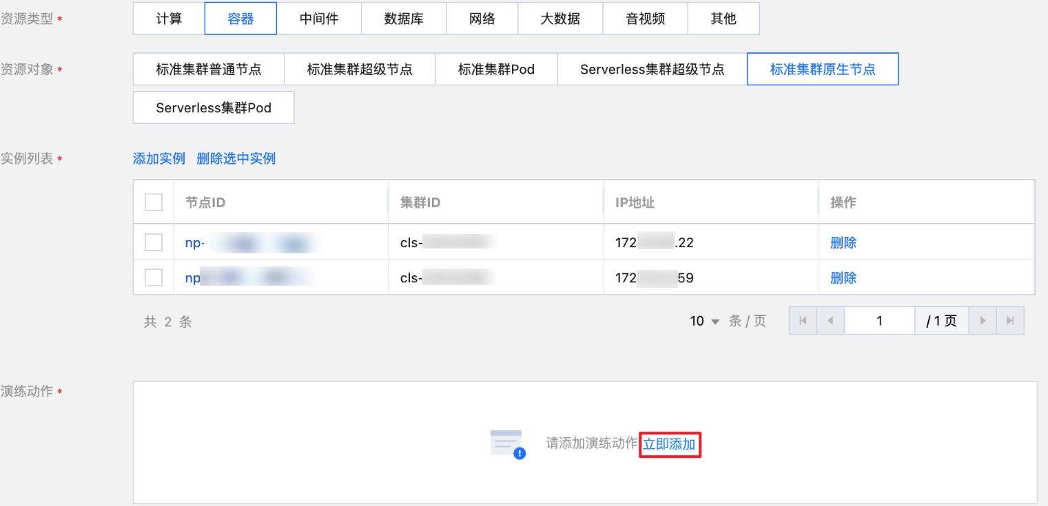 2. 新建容器节点:添加实例并部署测试服务。如果已有可用于演练的容器节点,则直接创建演练。
