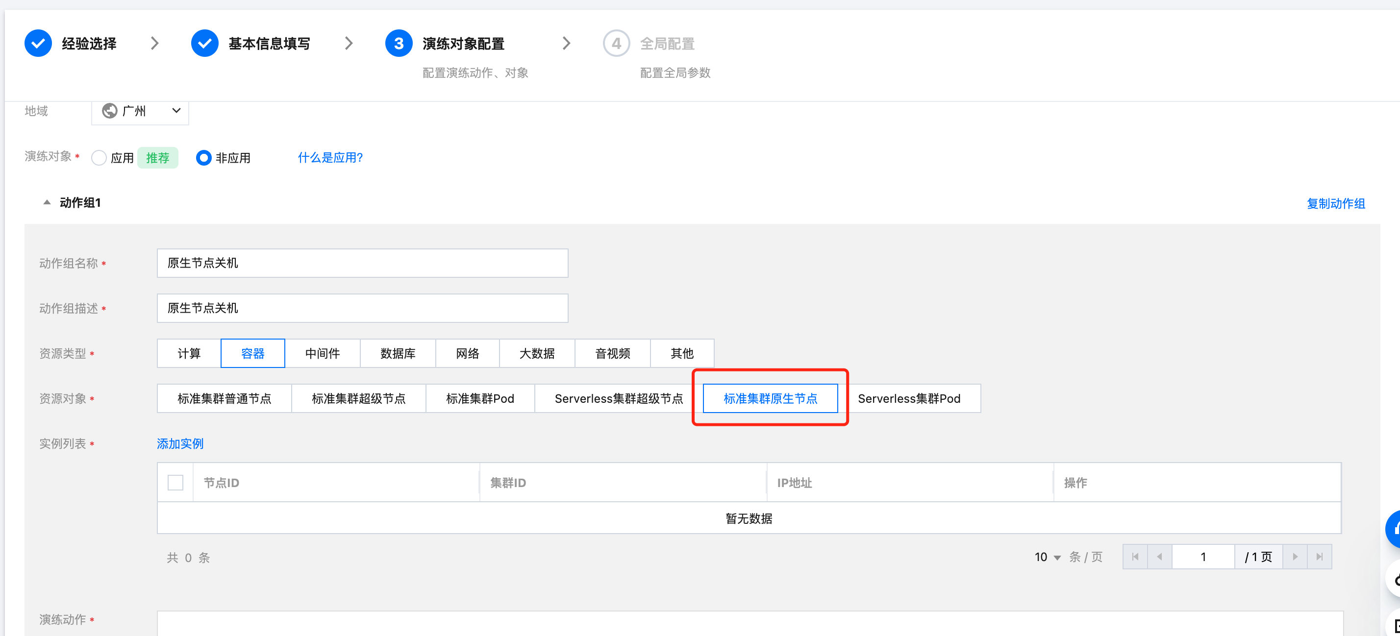 4. 进入演练对象配置页面,填写动作组编排信息。其中,资源类型选择容器,资源对象选择标准集群原生节点,然后在动作组中选择添加实例。