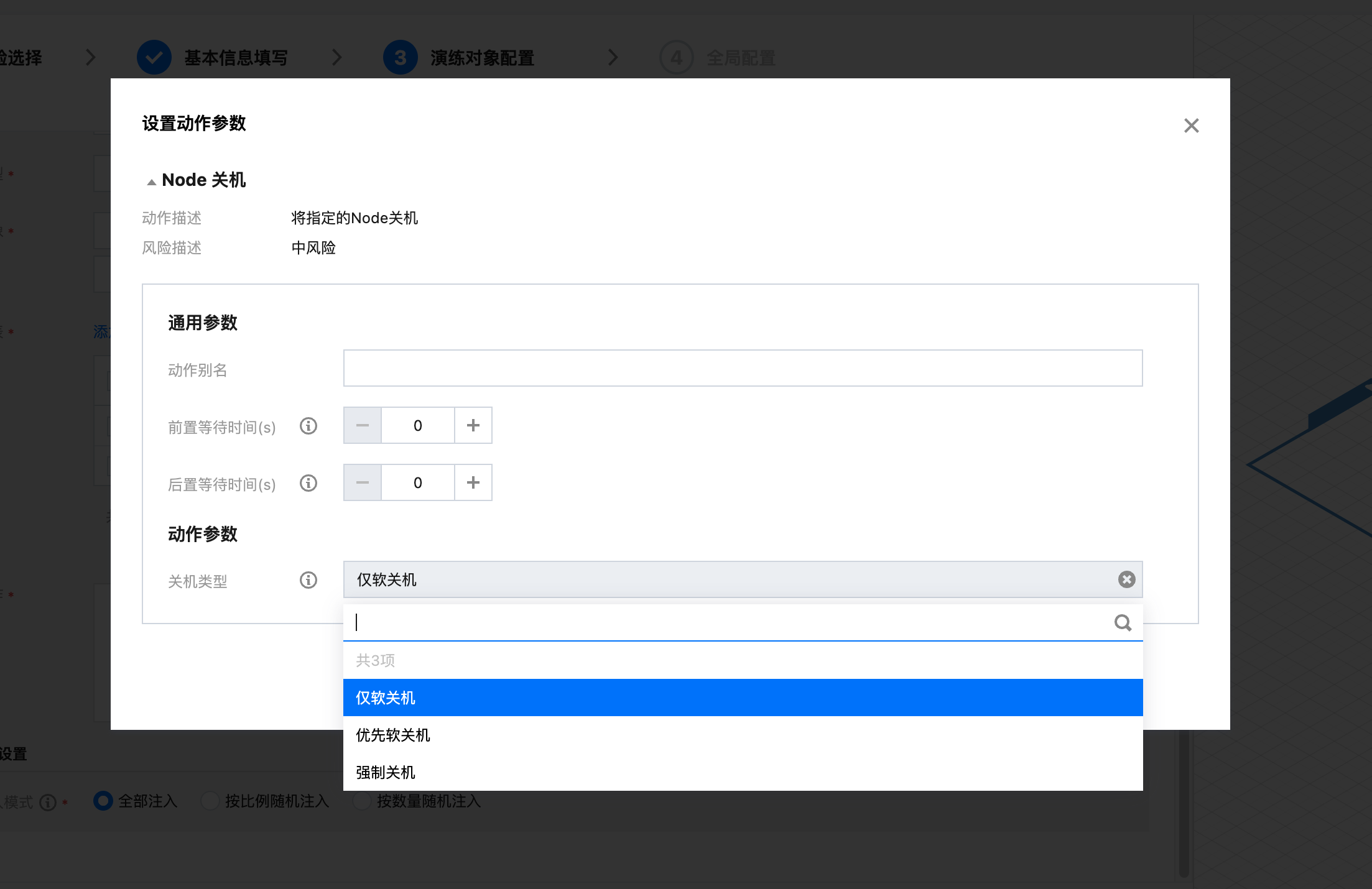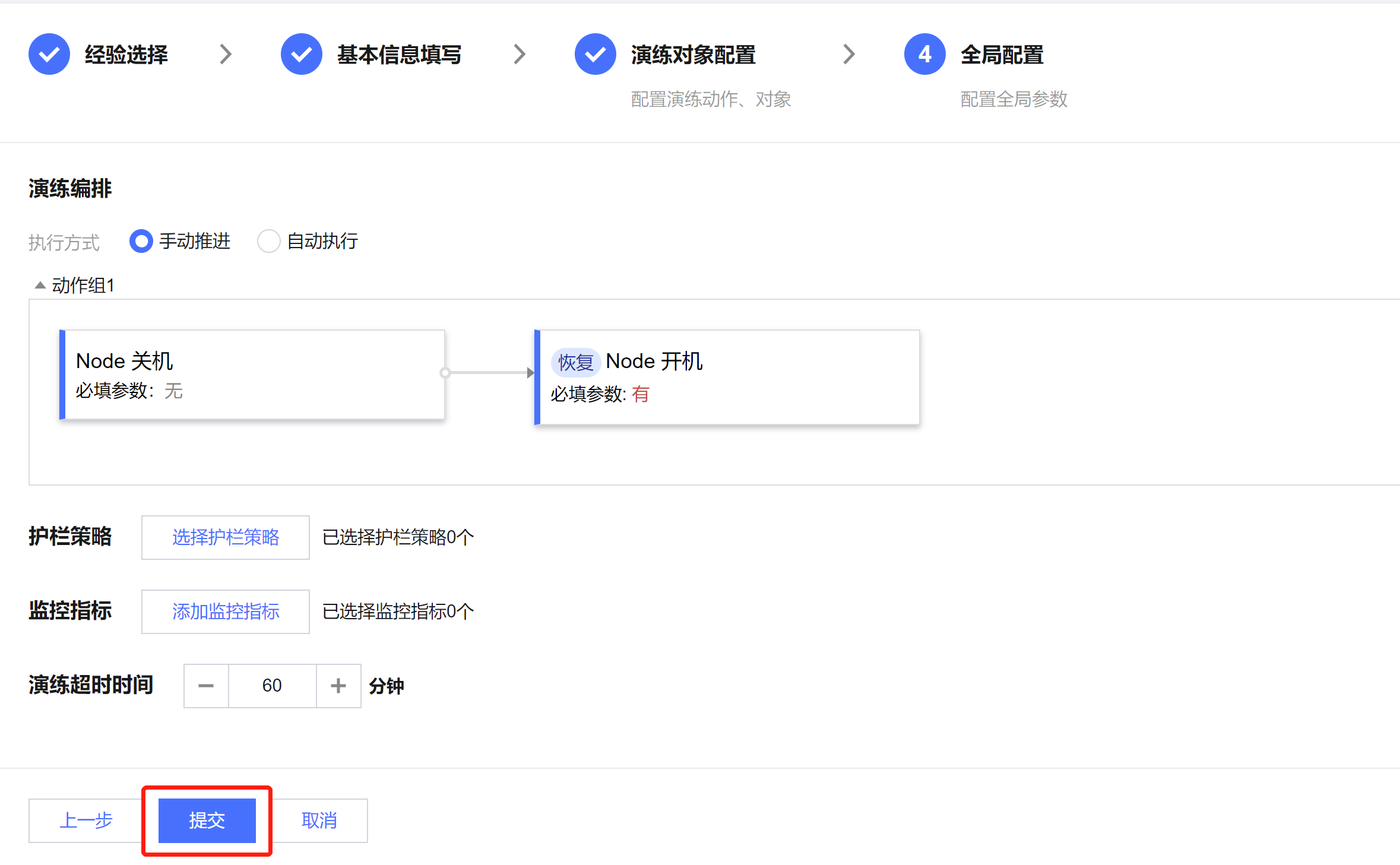 8. 动作参数配置完成之后,单击下一步。根据实际情况配置护栏策略和监控指标,单击提交,完成演练创建。