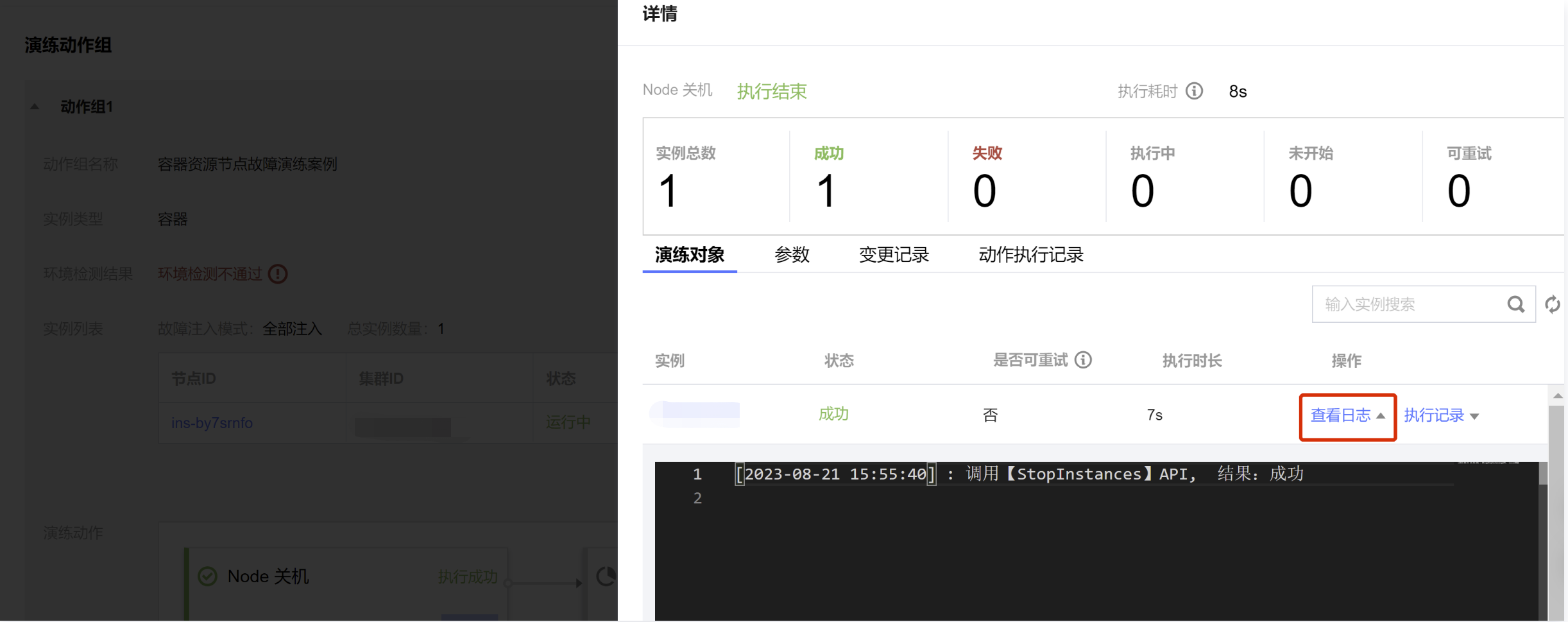 9. 执行恢复动作,查看日志,确认恢复动作执行成功。