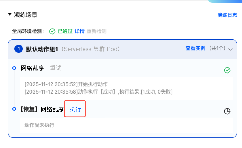 3. 故障注入完成后,点击恢复动作后的执行,将注入的故障恢复。