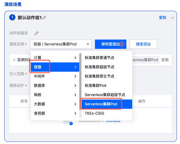 3. 在演练实例中,选择容器- Serverless 集群 Pod,选择后点击搜索添加,添加实例资源。亦可通过架构图添加方式,直接点击架构图上的 TKE 资源,选择实例进行添加。