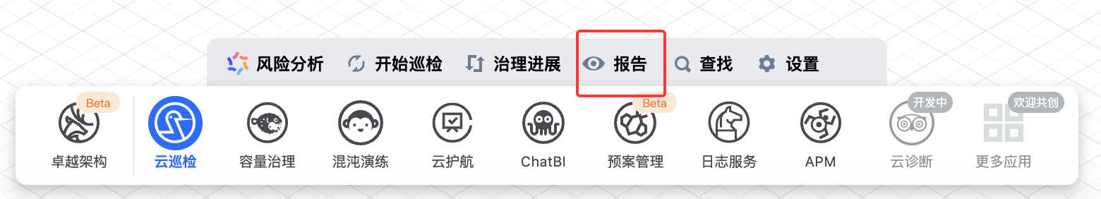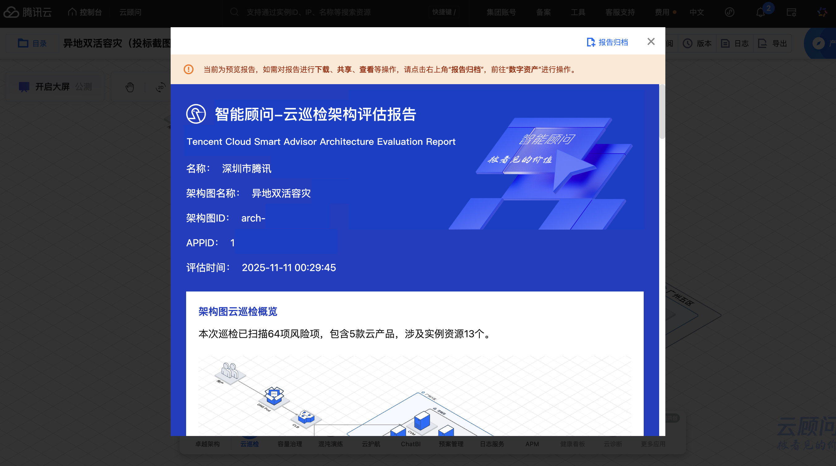 1. 在架构图页面,进入“云巡检”应用,单击报告。则可基于当前架构图风险生成一份巡检报告。如下图所示: