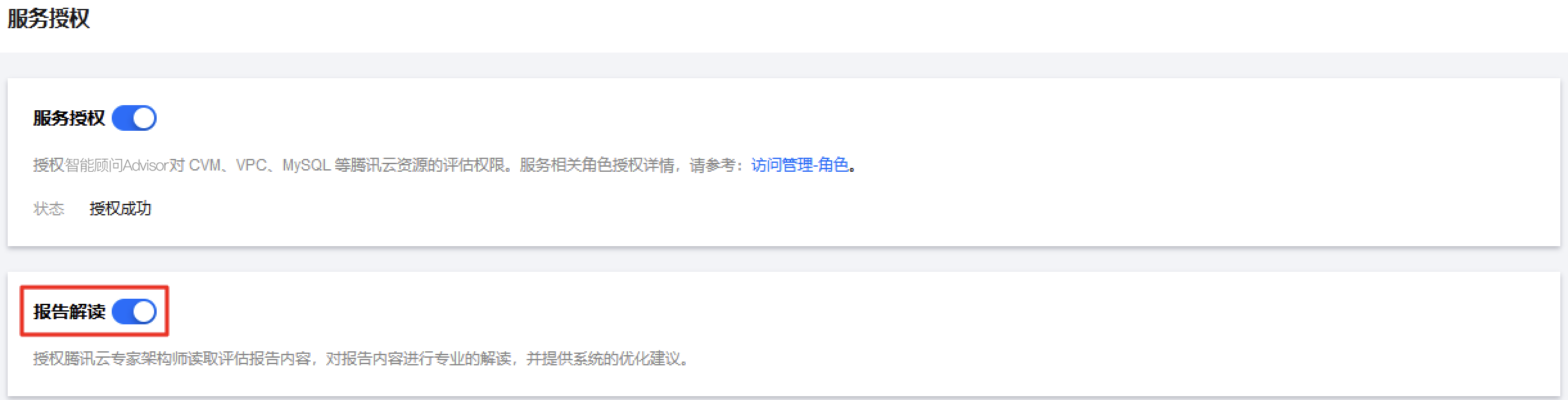 首次使用时,需要授权腾讯云智能顾问访问相关云产品配置权限。若您已为智能顾问授权,则请跳过该步骤。
