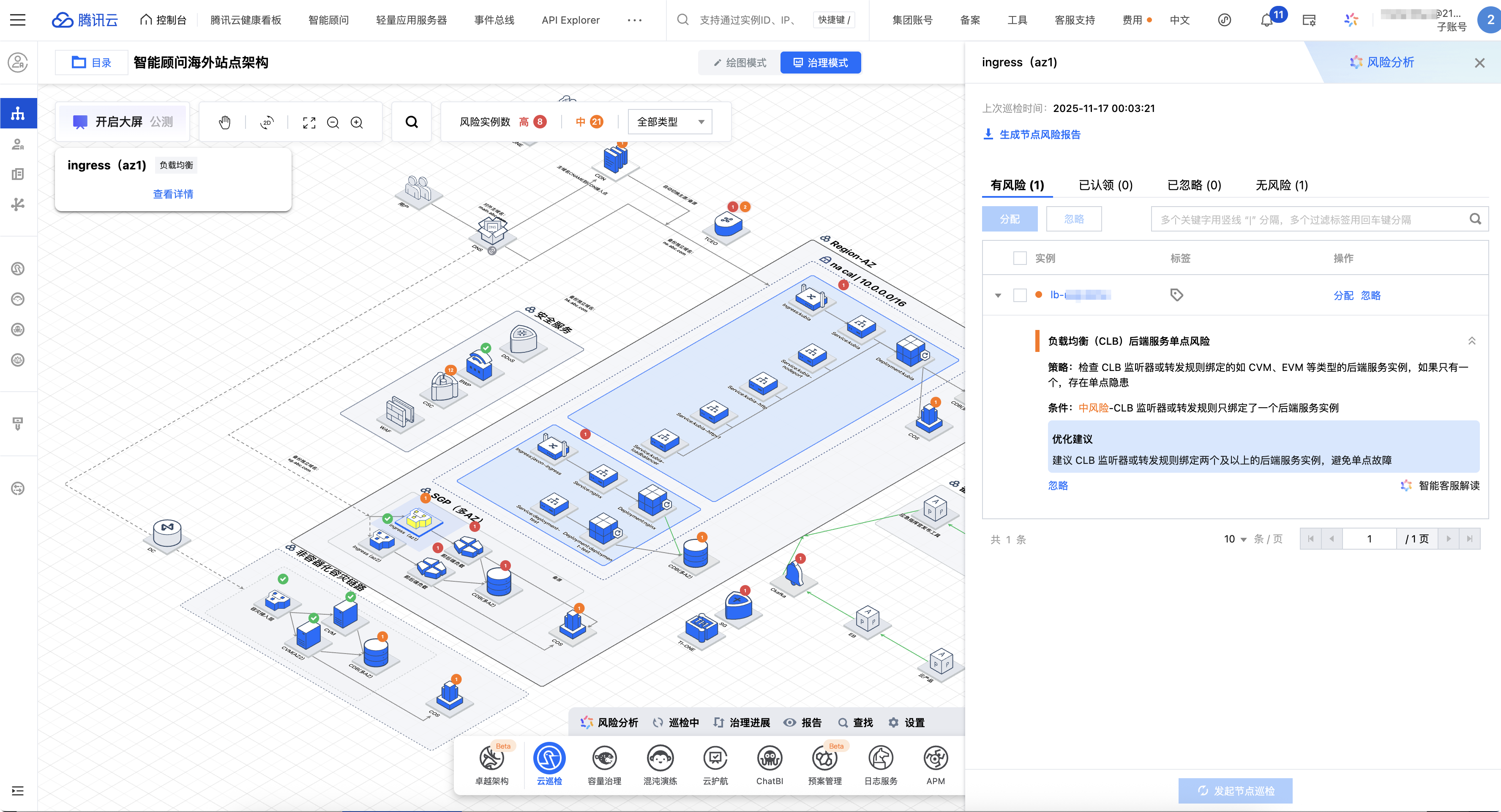 将云巡检所发现的风险项按架构图和地域资源分布的方式进行统计和呈现,帮助您有针对性地进行风险治理。