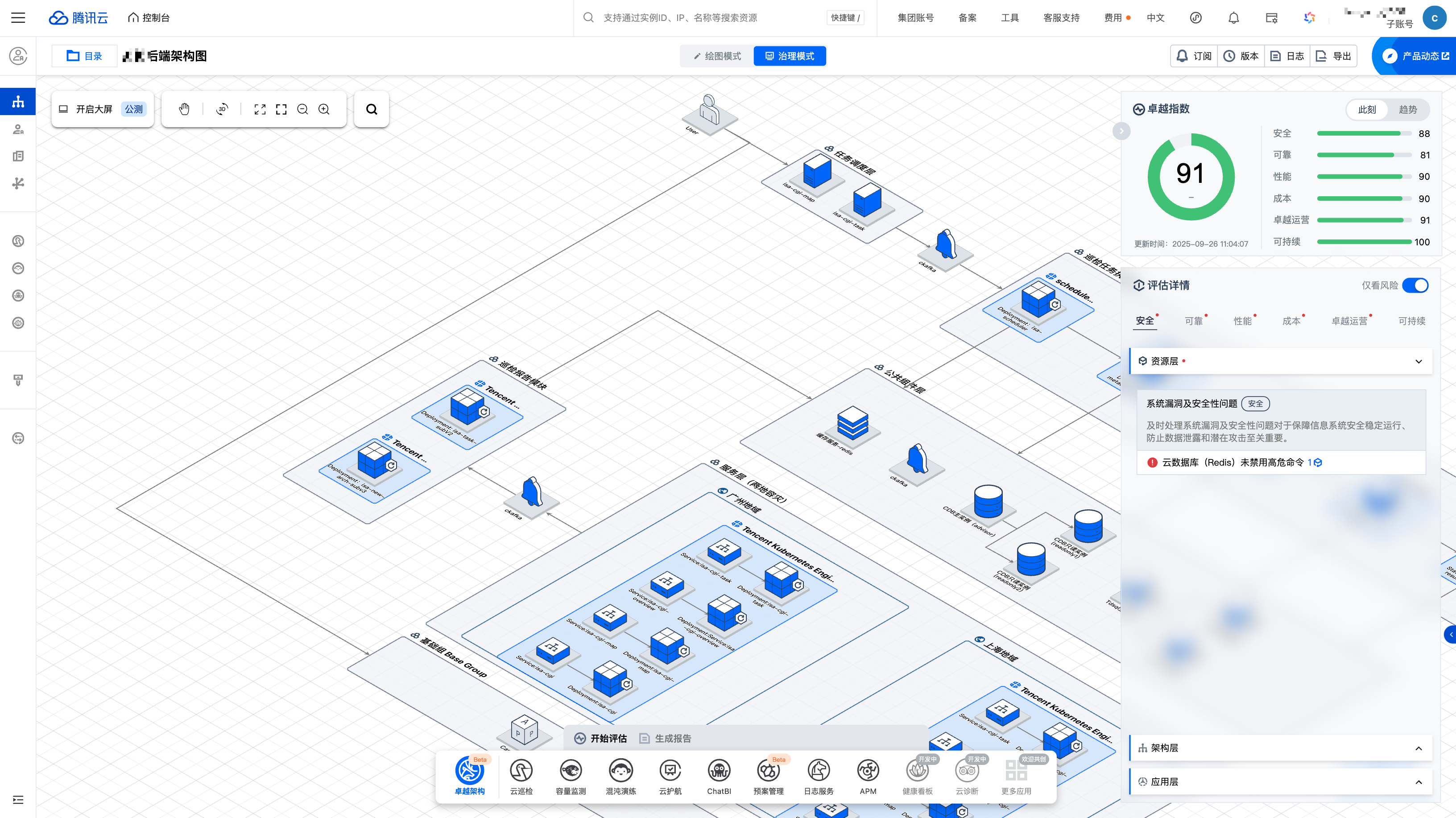 切换到治理模式之后,默认将进入卓越架构评估模块。该模块采用先进的评估体系,对架构进行全面而深入的分析,涵盖资源层、架构层、应用层三个核心层级,以及安全、可靠性、性能、成本、卓越运营和可持续性这六个卓越架构框架关键维度。通过这一立体的评估流程,系统能够精准计算出架构的卓越指数,并提供针对性的治理建议,指数计算详情请参见 云顾问-卓越架构。用户可根据每条治理建议的指引,轻松点击跳转至相应的应用界面,执行云上治理操作,从而不断优化并提高架构的卓越指数。