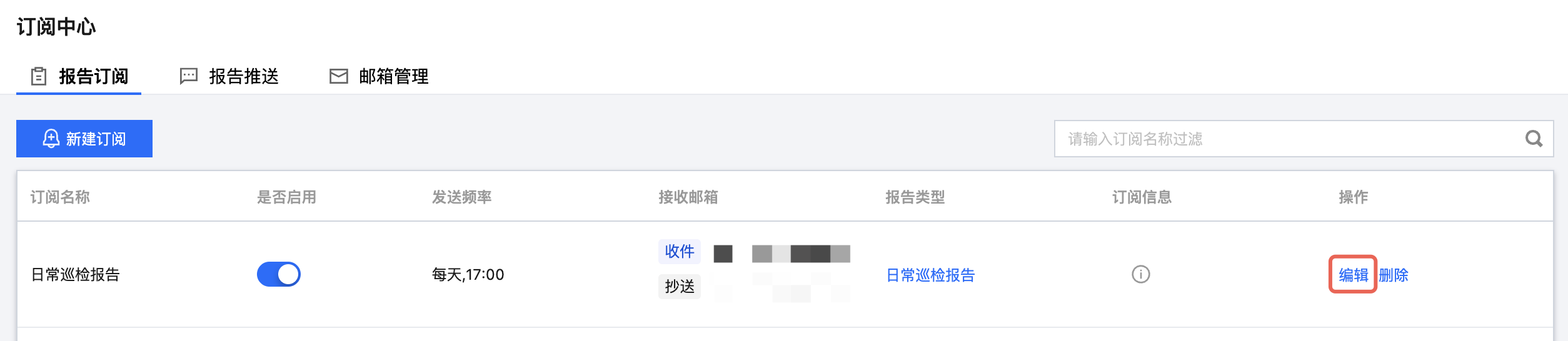 1. 在订阅中心 > 报告订阅页面,选中您想要修改的订阅,单击该行右侧的编辑。如下图所示: