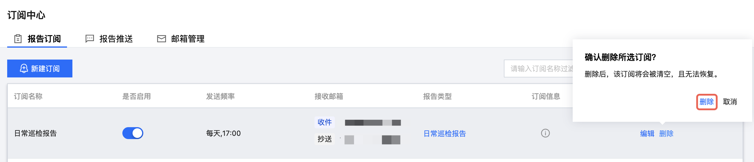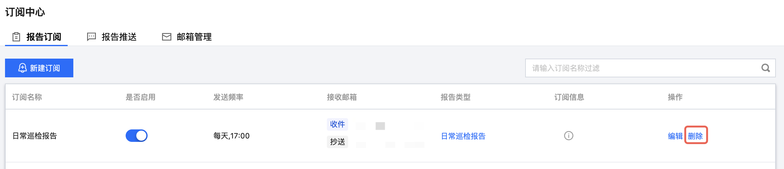 1. 在报告订阅 > 订阅列表页面,选中您想要删除的订阅,单击该行右侧的删除。如下图所示: