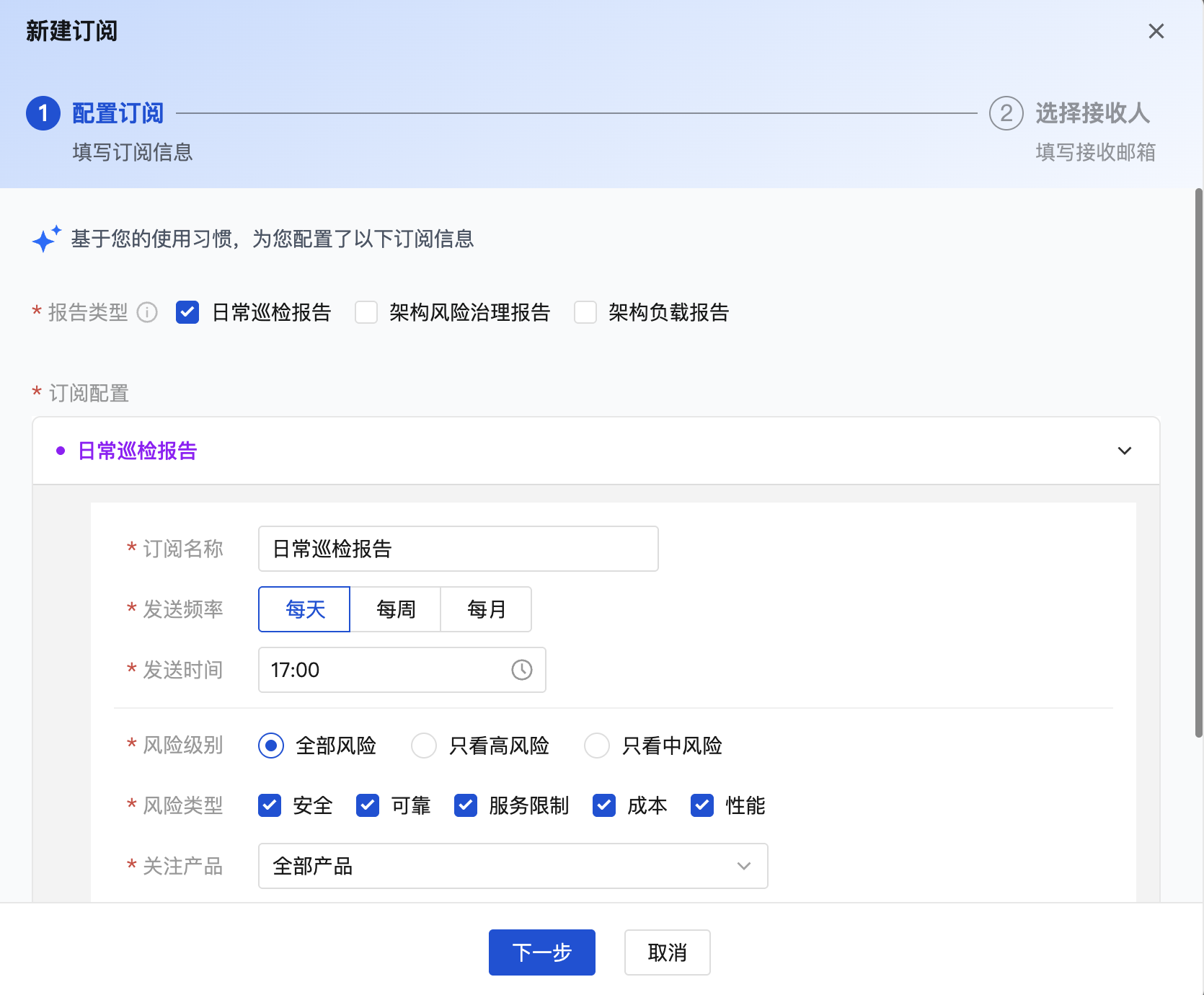 3. 在配置订阅步骤中,已默认配置订阅信息。您可根据需要勾选报告类型并调整订阅配置,完成后点击下一步继续。