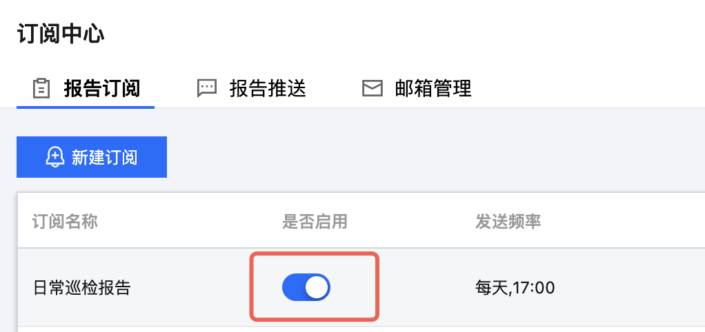 在订阅中心 > 报告订阅页面,您可以切换已创建订阅的“启用”状态,实现订阅服务的开启或关闭。如下图所示: