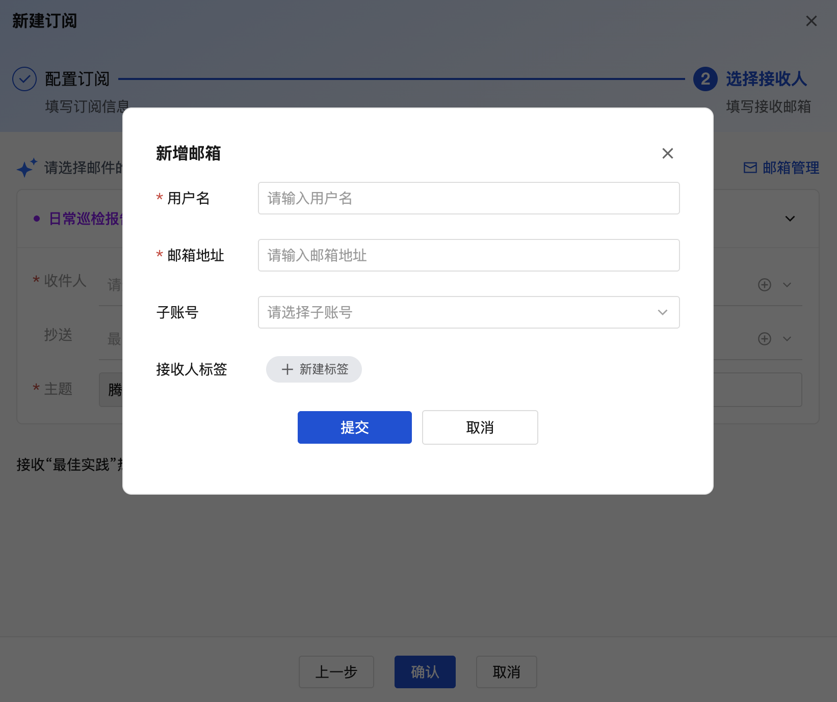 5. 在新增邮箱中填写接收人信息,单击提交。