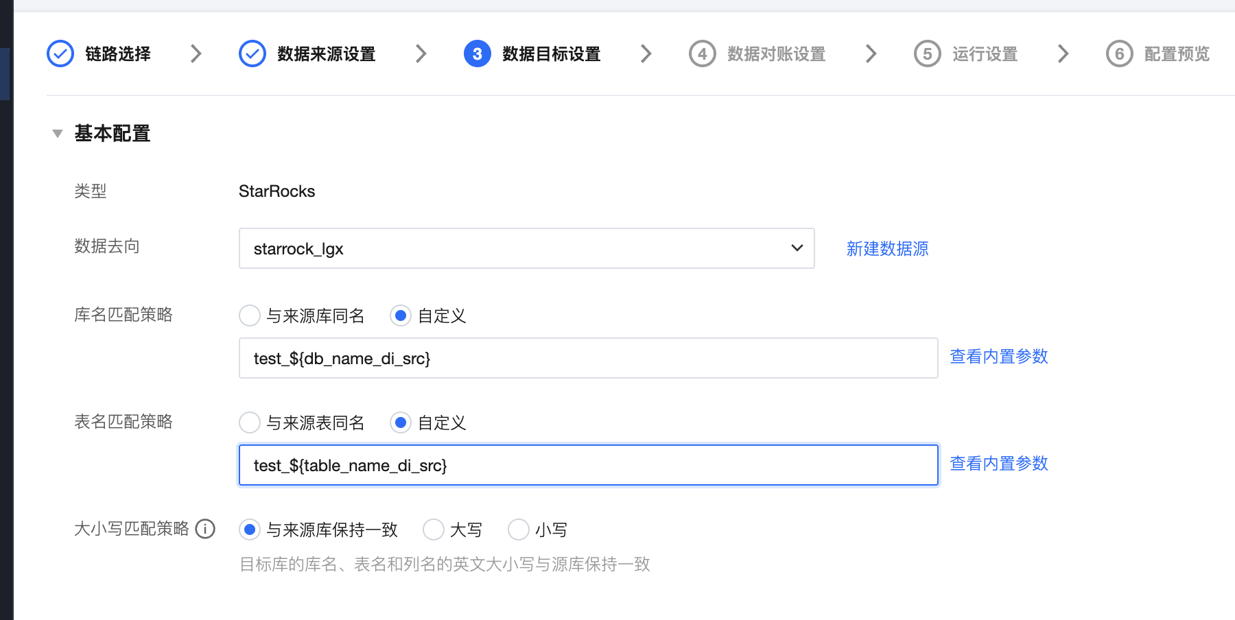 库/表匹配策略 | StarRocks 中数据库以及数据表对象的名称匹配规则: 默认与来源库/来源表同名。 自定义:支持使用内置参数和字符串组合生成目标库表名称。 说明: 示例:如来源表名称为 table1,映射规则为 ${table_name_di_src}_inlong,则 table1 的数据将被最终映射写入至 table1_inlong 中。 |