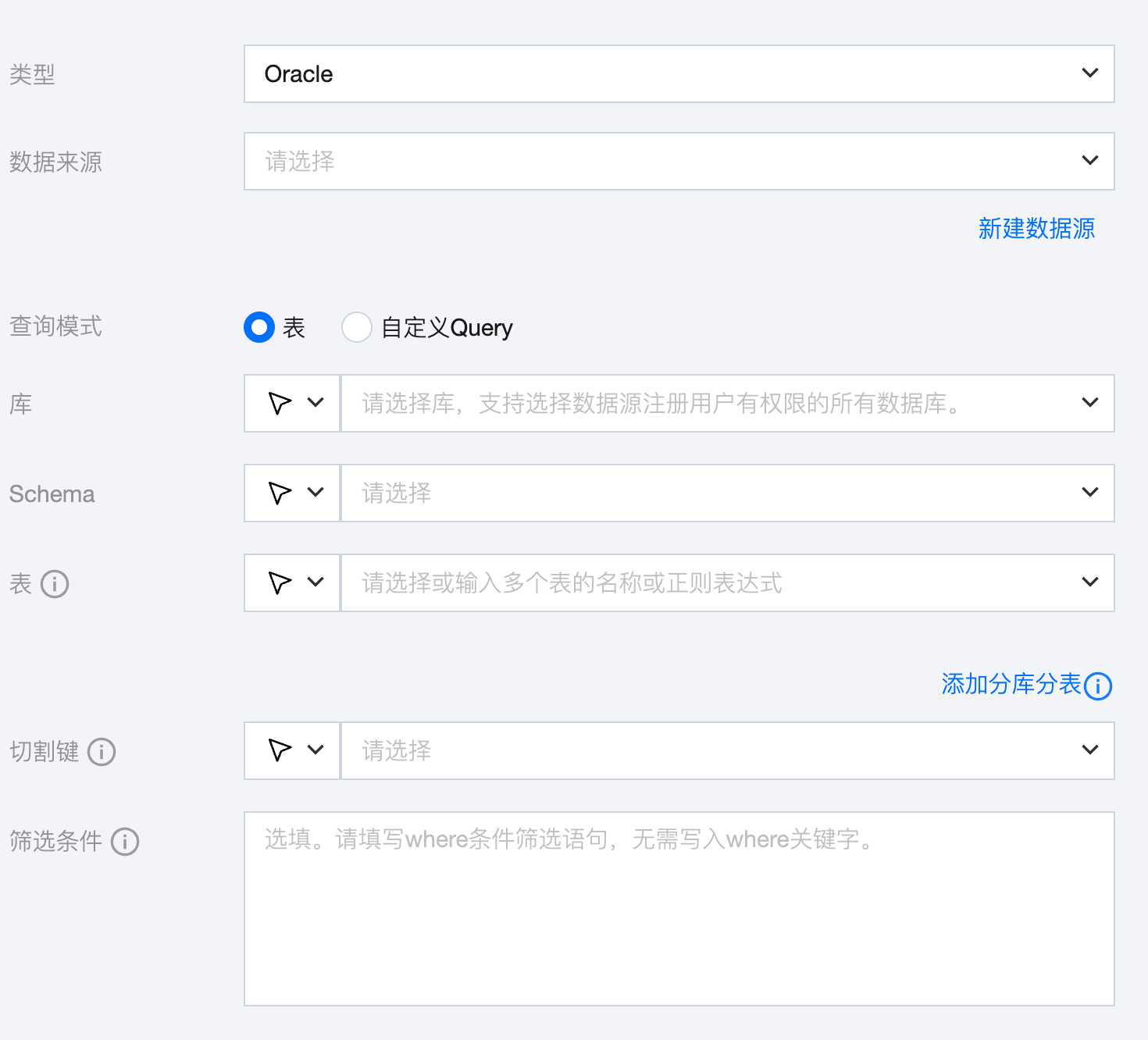 筛选条件(选填) | Oracle 根据指定 where 条件拼接 SQL,并根据该 SQL 进行数据抽取。例如,在测试时指定 where 条件为 row_number()。 where 条件可以有效地进行业务增量同步 。 where 条件不配置或为空时,将视作全表同步数据 。 |