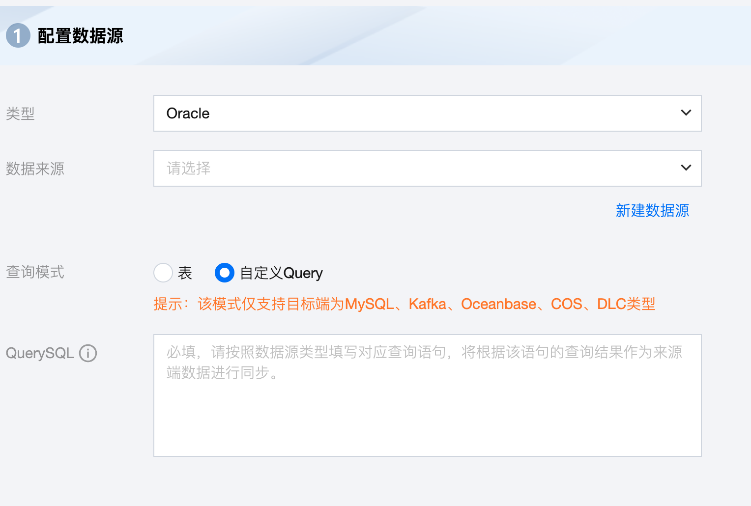自定义 Query | 需按照数据源类型填写对应查询语句,将根据该语句的查询结果作为来源端数据进行同步。 |