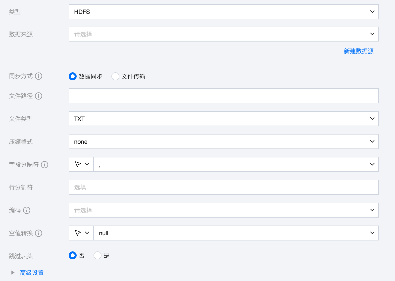 同步方式 | HDFS 支持两种同步方式: 数据同步:解析结构化数据内容,按字段关系进行数据内容映射与同步。 文件传输:不做内容解析传输整个文件,可应用于非结构化数据同步。 注意:文件传输仅支持来源端、目标端均为文件类型(COS/HDFS/SFTP/FTP)的数据源,且来源端、目标端同步方式均需要为文件传输 |