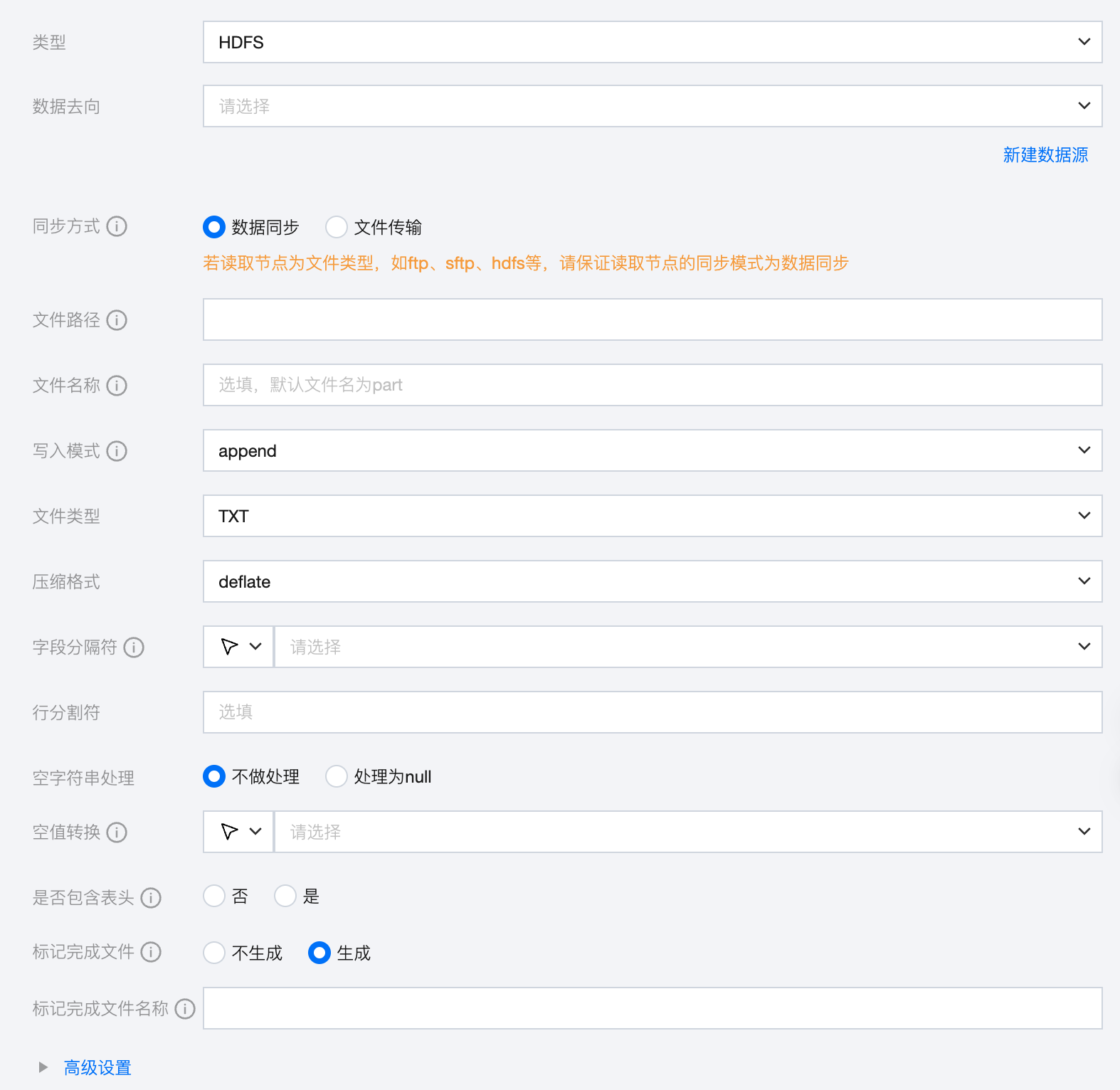数据去向 | 选择当前项目中可用的 HDFS 数据源。 |