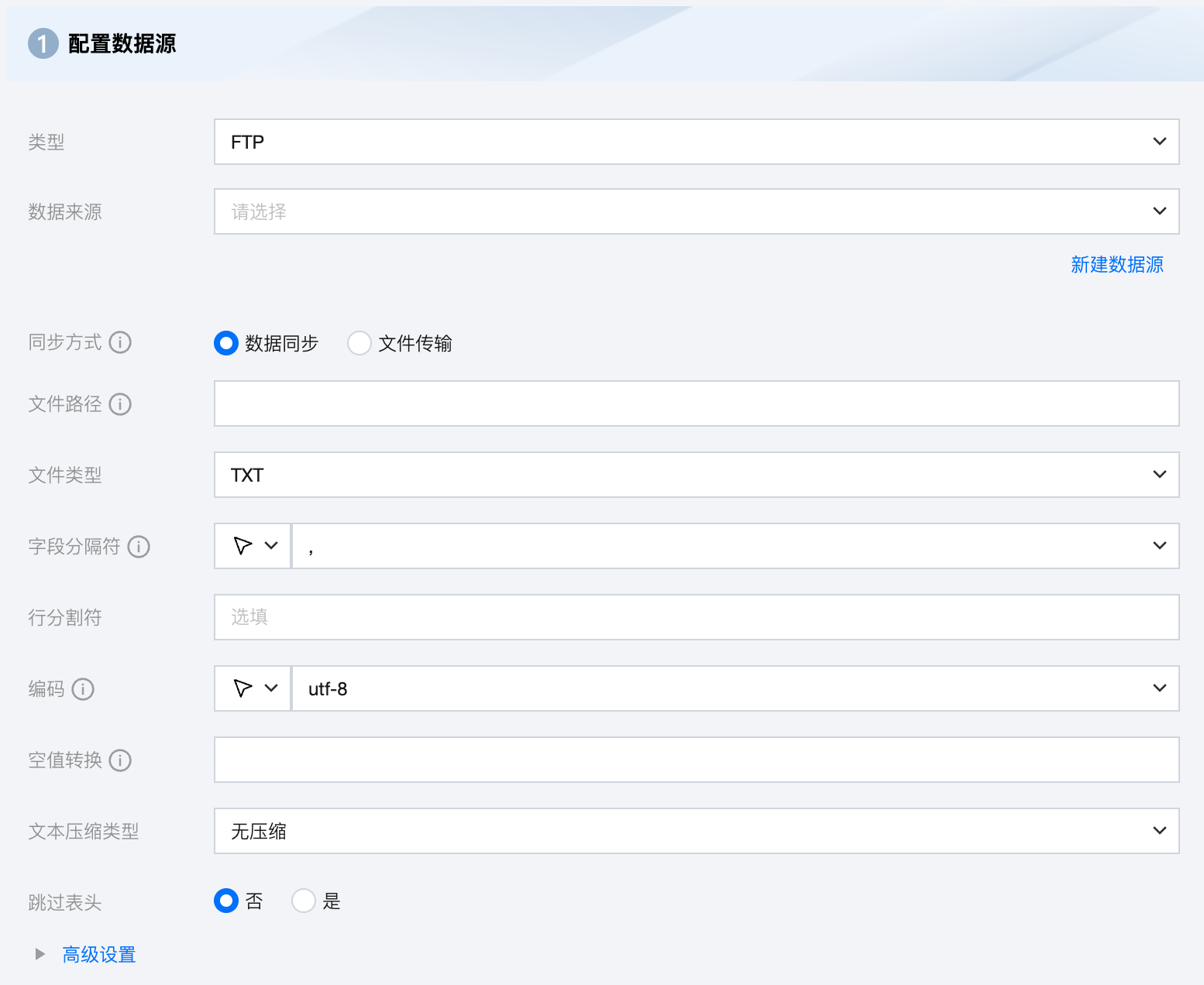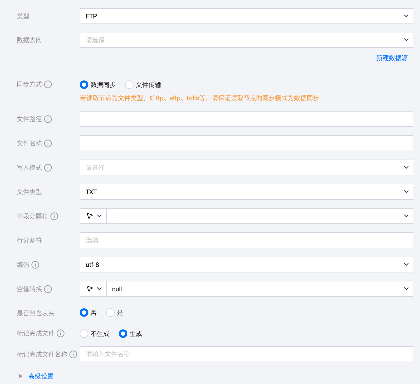 同步方式 | FTP 支持两种同步方式: 数据同步:解析结构化数据内容,按字段关系进行数据内容映射与同步。 文件传输:不做内容解析传输整个文件,可应用于非结构化数据同步。 注意: 文件传输仅支持来源端、目标端均为文件类型(COS/HDFS/SFTP/FTP)的数据源,且来源端、目标端同步方式均需要为文件传输。 |