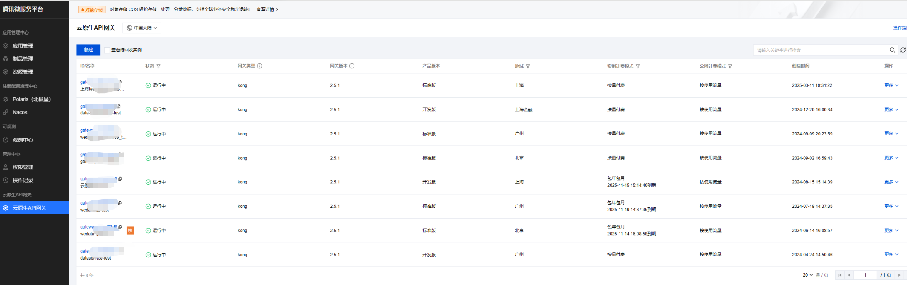 3. 网关实例购买成功后,您将在 实例列表 上看到您刚购买的实例名称。如下图所示: