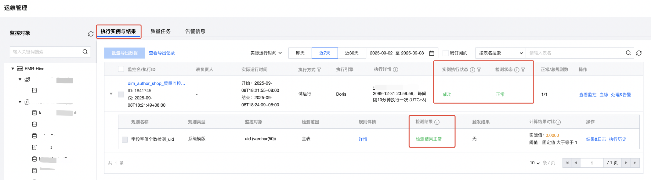 “实例执行状态”代表是否任务执行成功;“检测状态”代表是否至少存在一个规则被触发(异常);一个质量任务下可以包含多个质量规则,每个规则都可以查看对应的检测结果是否正常。