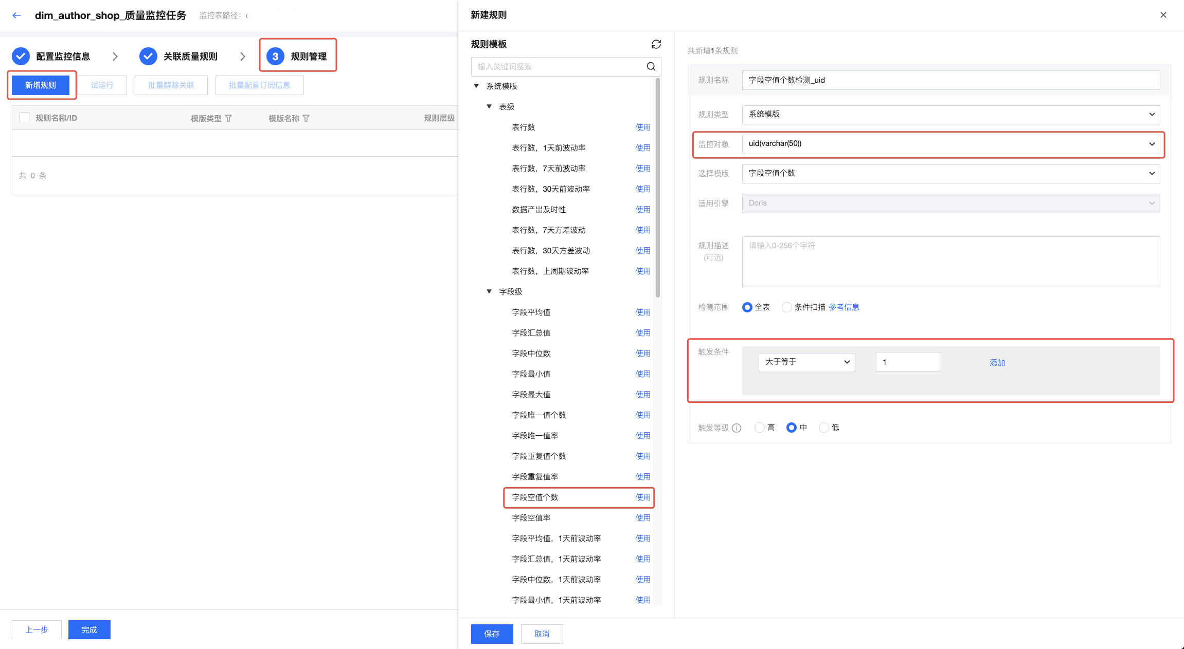 单击新增规则,选择“字段空值个数”规则。监控对象选择目标字段(以“uid”为例)。设置触发条件为大于等于1。即表示一旦uid字段存在空值,就触发质量告警通知,让相关人员第一时间知道。