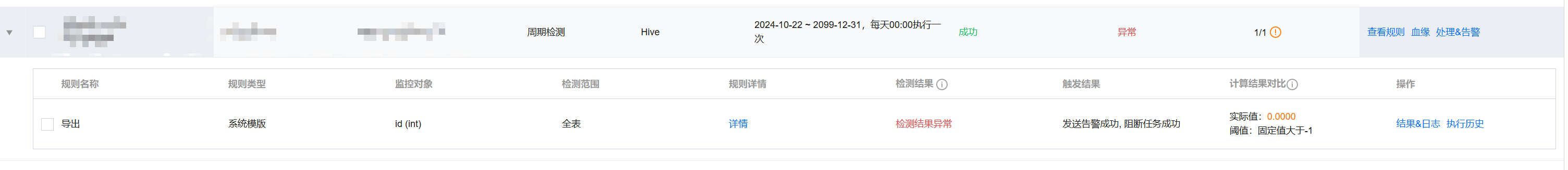 执行详情 | 如质量任务执行方式为周期检测,将显示设置的周期检测信息(时间范围、执行频次) 如果为调度触发,则显示关联调度任务 ID。 |