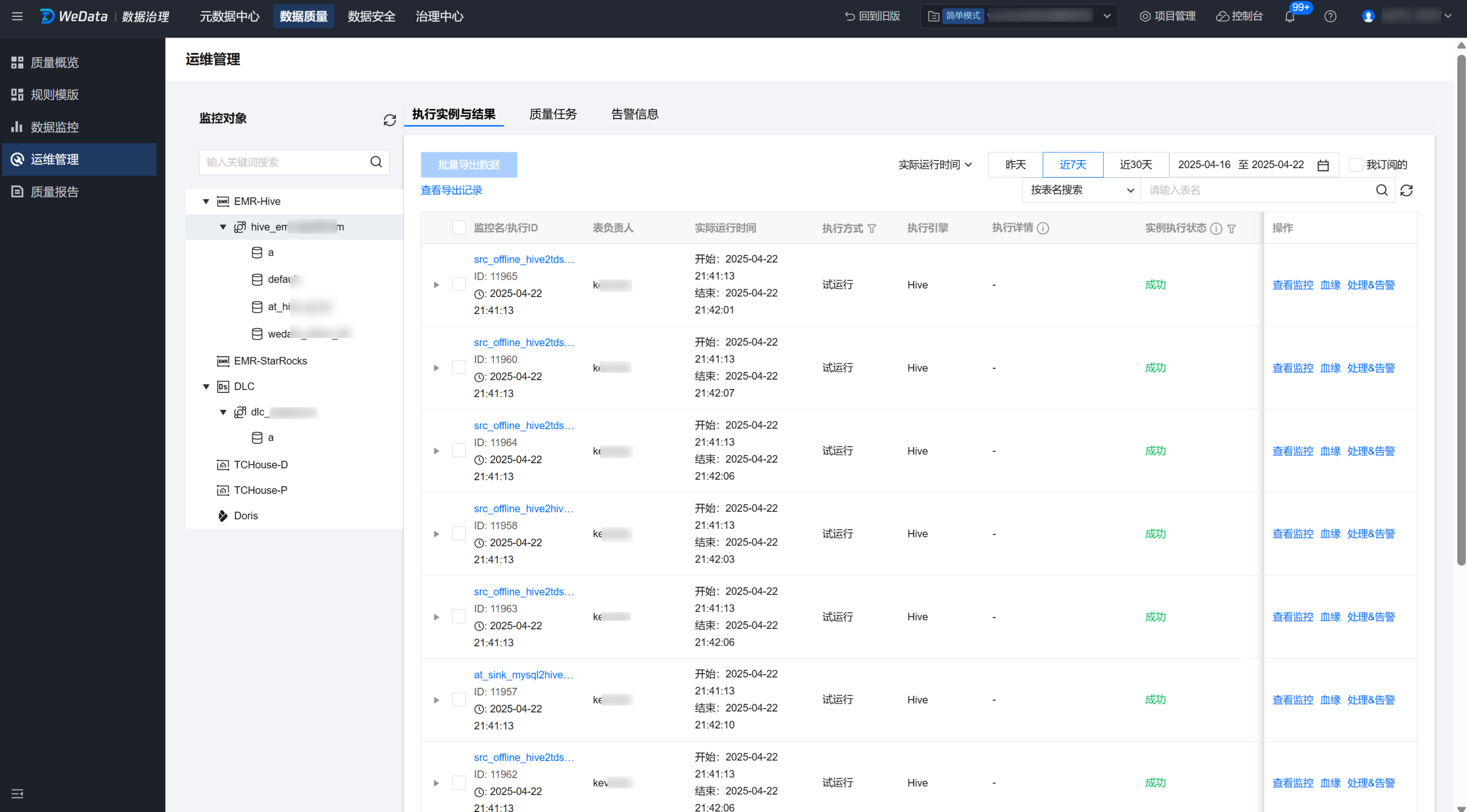 用户可在运维管理-执行实例与结果页面,查看质量检测任务运行情况。
