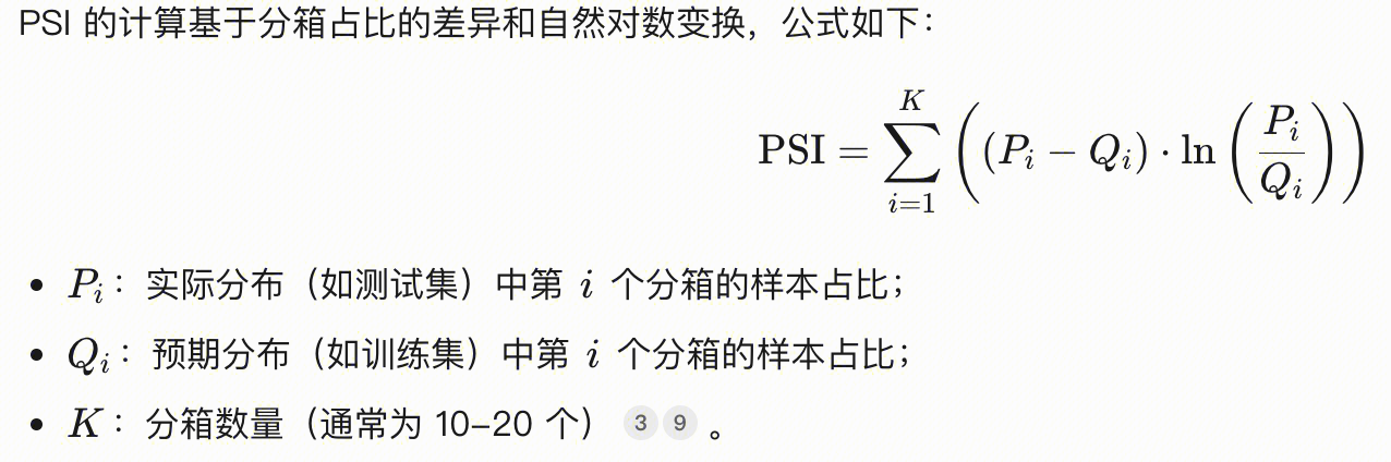 | | 群体稳定性指数 | 数值 | 是衡量两个群体(如训练集与测试集、不同时间段的样本)分布差异的指标,广泛应用于风控模型监控和特征稳定性评估。 ![]() |
