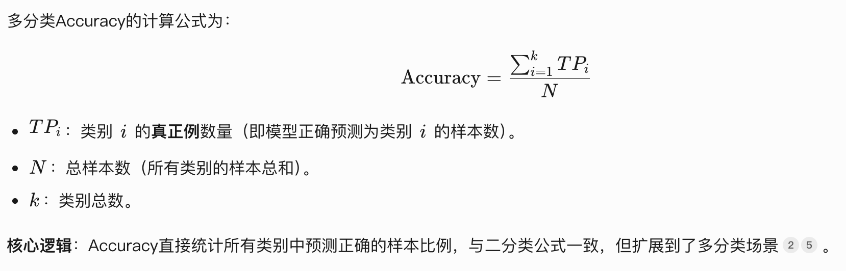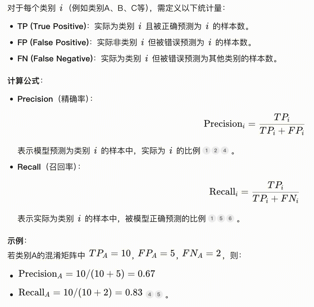 | | 精确率 | - | 预测为正类的样本中实际为正类的比例,TP/(TP+FP) True Positive(TP,真正):实际为正类且预测为正类。如:label为A类,且predict为A类。 False Positive(FP,假正):实际为负类但预测为正类。如:label不为A类,且predict为A类。 False Negative(FN,假负):实际为正类但预测为负类。如:label为A类,且predict不为A类。 True Negative(TN,真负):实际为负类且预测为负类。如:label不为A类,且predict不为A类。 ![]() |