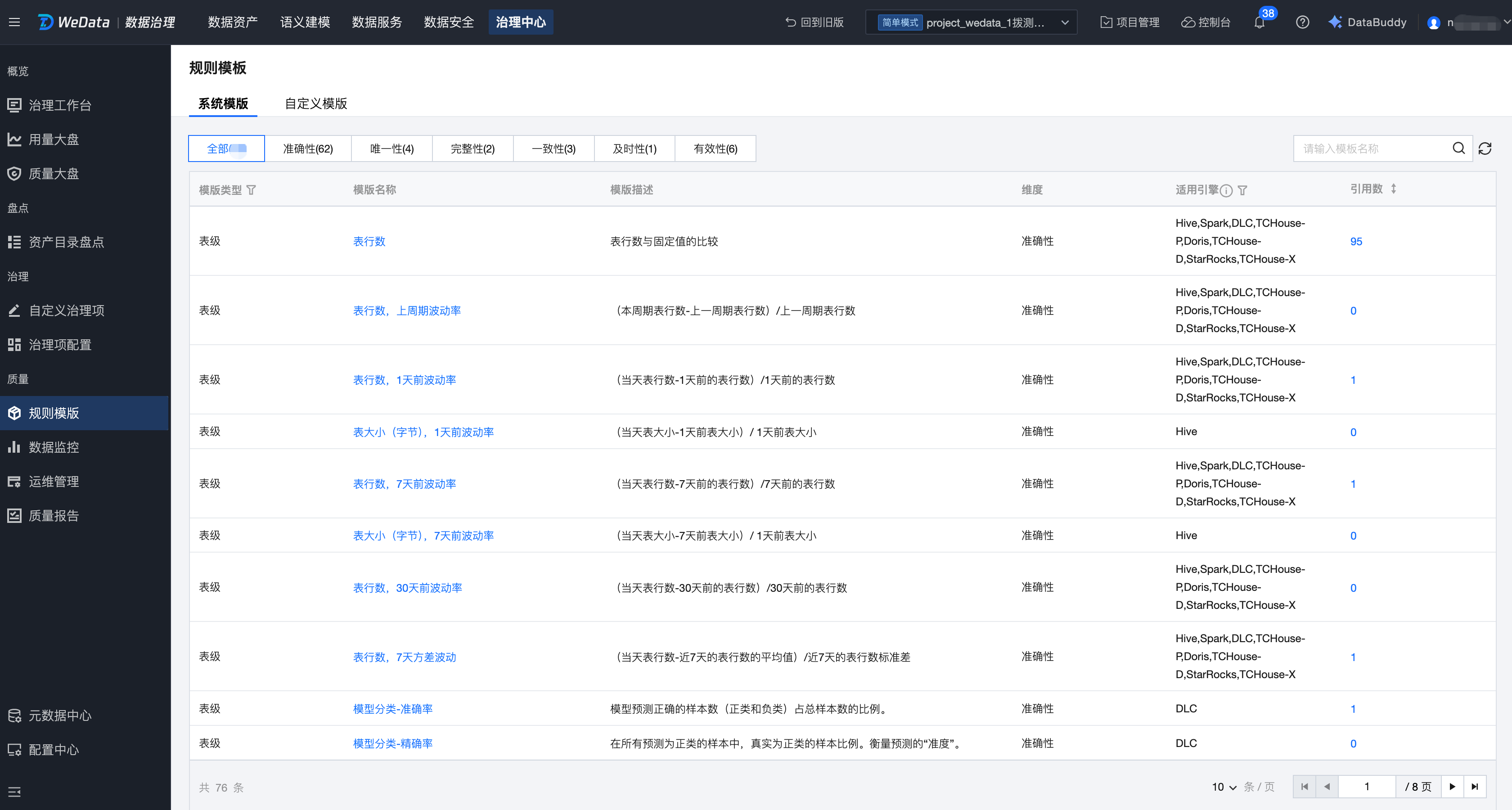 从准确性、唯一性、完整性、一致性、及时性、有效性等维度提供了76个模板,如下: