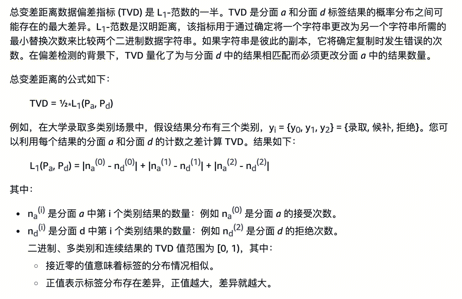 | | 总变差距离 | 类别 | 是衡量两个概率分布差异的核心指标,尤其适用于检测数据分布偏移。 ![]() |