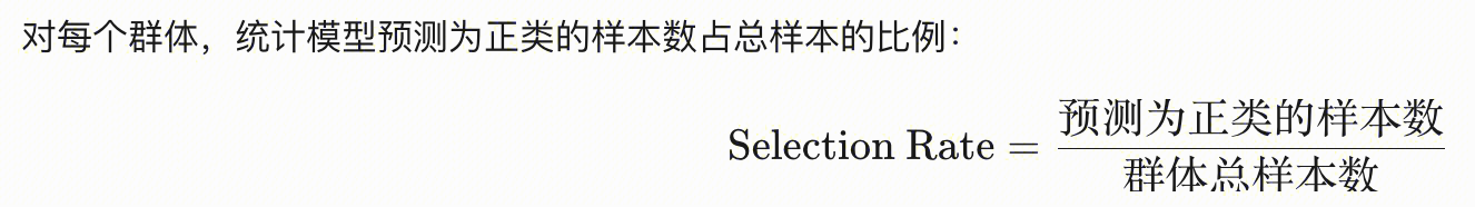 | | 统计奇偶性 | - | 用于衡量模型在不同群体(如性别、种族等敏感属性划分的群体)中预测结果的分布均衡性。其核心思想是:模型对不同群体的预测为正类的概率应相同,即无论群体属性如何,获得正向预测的机会均等。 测算指定群体属性的统计奇偶性,比如分别抽取出所有白人、黑人的信贷审批结果进行计算selection rate: ![]() 如白人的selection rate=白人被预测为正类的样本数/白人总数 |