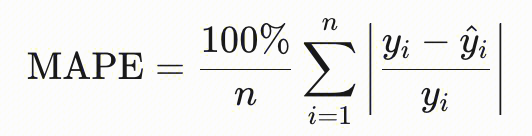 | | 平均绝对百分比误差(MAPE) | - | 取值为0到无穷,数值越低越好,对低估误差(预测值 < 真实值)的惩罚高于高估误差。yi为 label值,另一个带上三角的为predict值。 ![]() |
