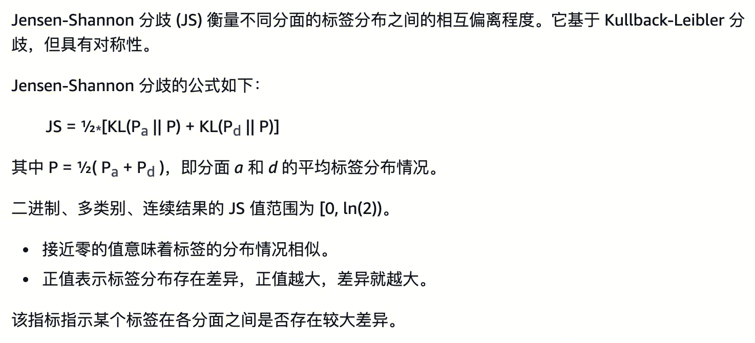 | | 詹森-香浓散度 | 类别 | 是衡量两个概率分布之间差异的对称化度量,基于Kullback-Leibler(KL)散度构建。它在分布偏移检测中常用于量化数据分布的变化程度,尤其在机器学习模型监控和数据漂移分析中具有重要应用。 ![]() |