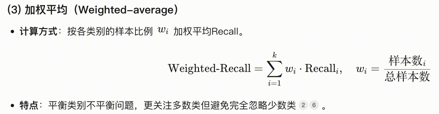 | | 召回率 | - | 为正类的样本中被正确预测的比例,TP/(TP+FN) True Positive(TP,真正):实际为正类且预测为正类。如:label为A类,且predict为A类。 False Positive(FP,假正):实际为负类但预测为正类。如:label不为A类,且predict为A类。 False Negative(FN,假负):实际为正类但预测为负类。如: label为A类,且predict不为A类。 True Negative(TN,真负):实际为负类且预测为负类。如:label不为A类,且predict不为A类。 如果是多分类: ![]() ![]() |