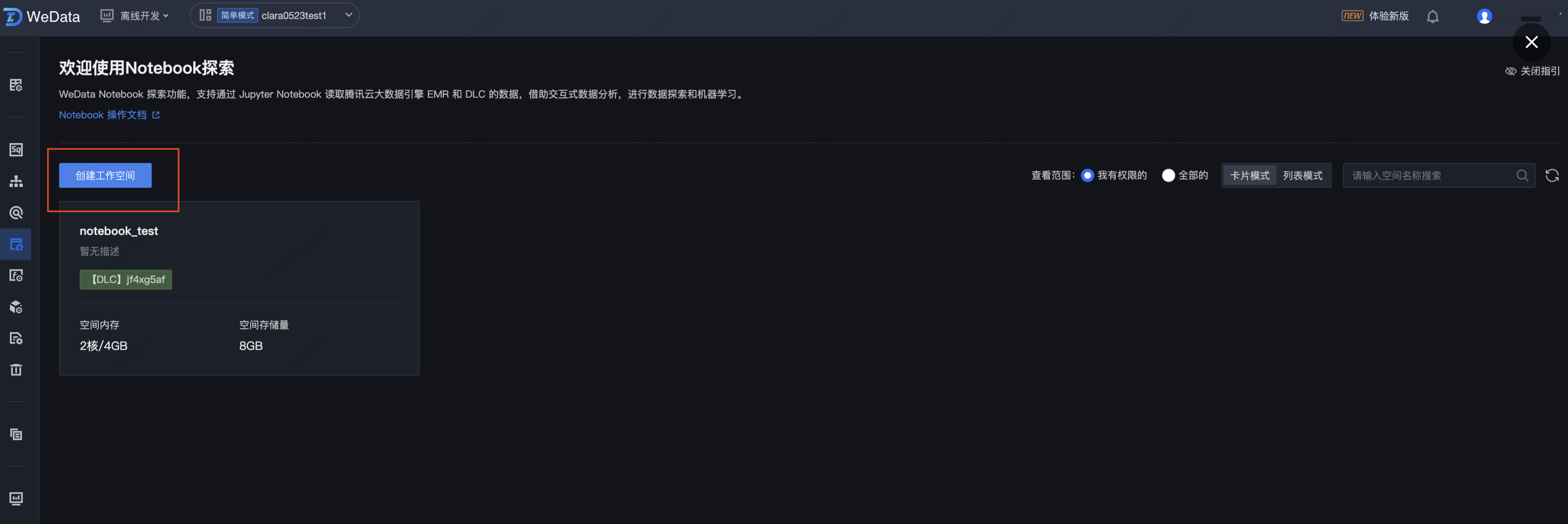 空间名称 | Notebook 工作空间名称,支持中文、英文、数字、下划线、中划线,长度不超过32字符 | 是 |