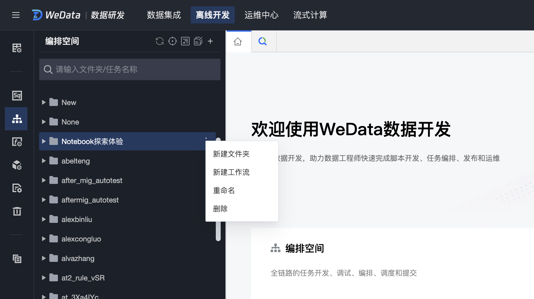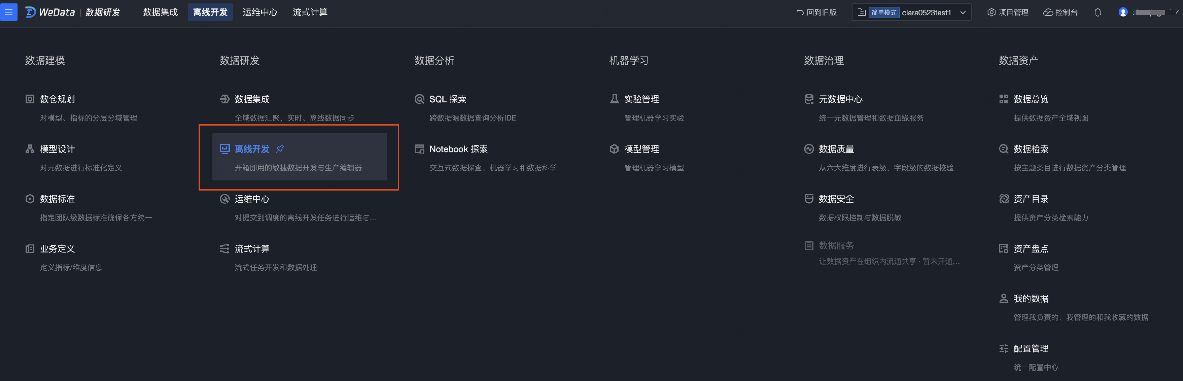 1. 进入项目,并打开菜单数据研发 > 离线开发。