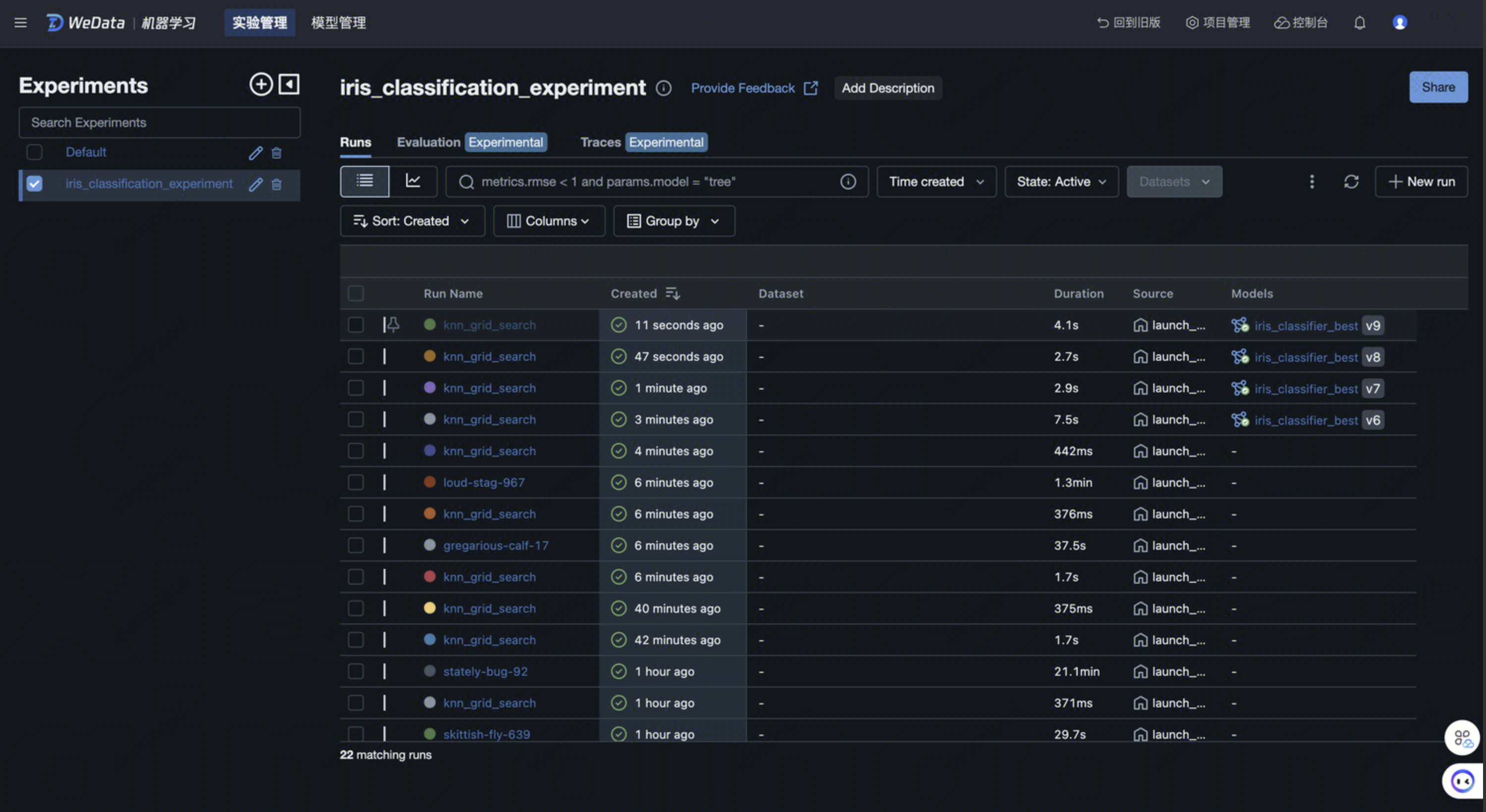 MLflow 是一个开源的机器学习平台,它提供了数据科学生命周期的端到端支持,包括实验管理、模型版本控制、模型部署和模型监控。如果当前工作空间启用了 MLflow 服务,您可以在实验中通过调用 MLflow 的相关函数来记录每一次实验的参数、指标和结果,并在 WeData 机器学习模块 > 实验管理和模型管理中进行查看,从而实现实验的追踪和可复现性。