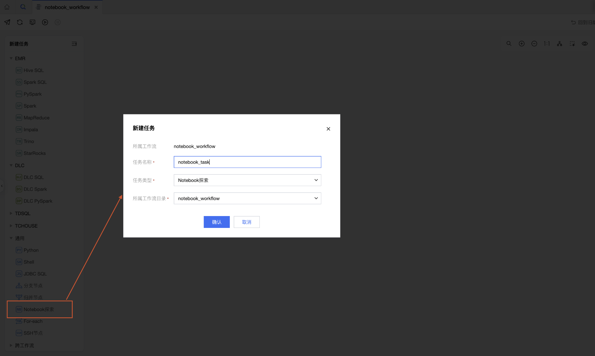 3. 在工作流中创建任务,任务类型为通用-Notebook 探索,在新建任务页面配置任务基本属性,包括任务名称、任务类型等。