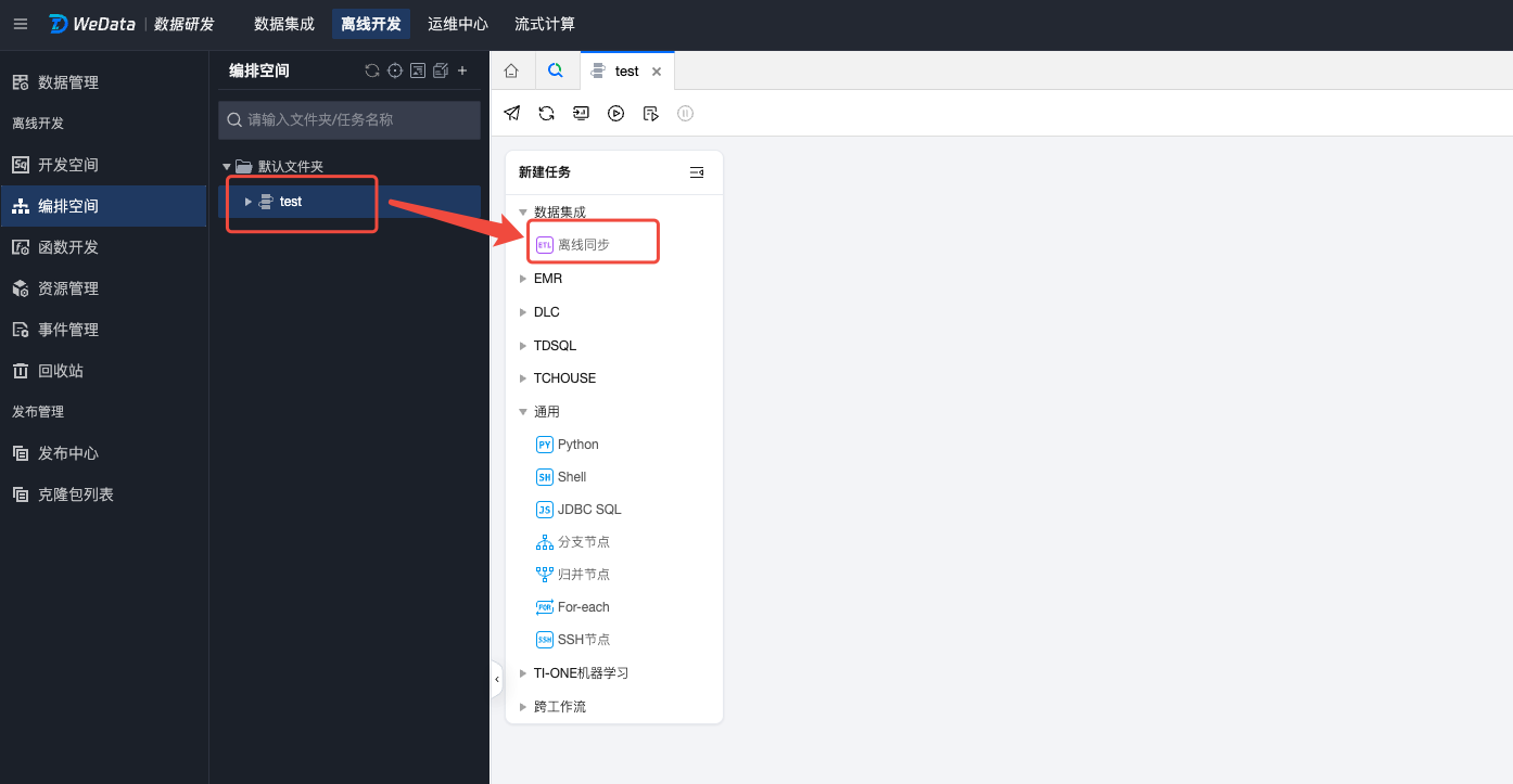 登录腾讯云后进入WeData 控制台,选择项目进入离线开发 > 编排空间 页面,点击选择一个工作流 ,然后单击新建离线同步任务,或者选择项目进入数据集成 > 离线同步 页面,单击新建,配置离线同步任务;