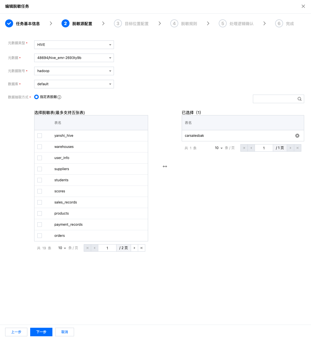进入脱敏源配置界面,选择脱敏表(最多可支持选择五张表)。